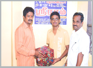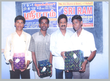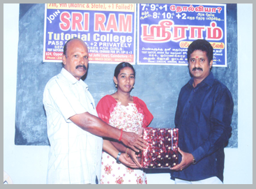 Director of Sri Ram Tutorial College Mr.Ramakrishnan distributing prize to Mr.Sankar who passed 8th & 10th Public exams in same year.