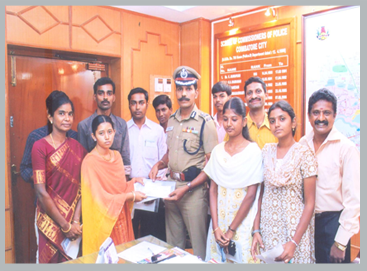Ms.Priyanka (Physically Challenged) scored 1003/1200 in the 12th Public Examination. Comissioner Mr.Magali gave a gold coin for her excellent performance.